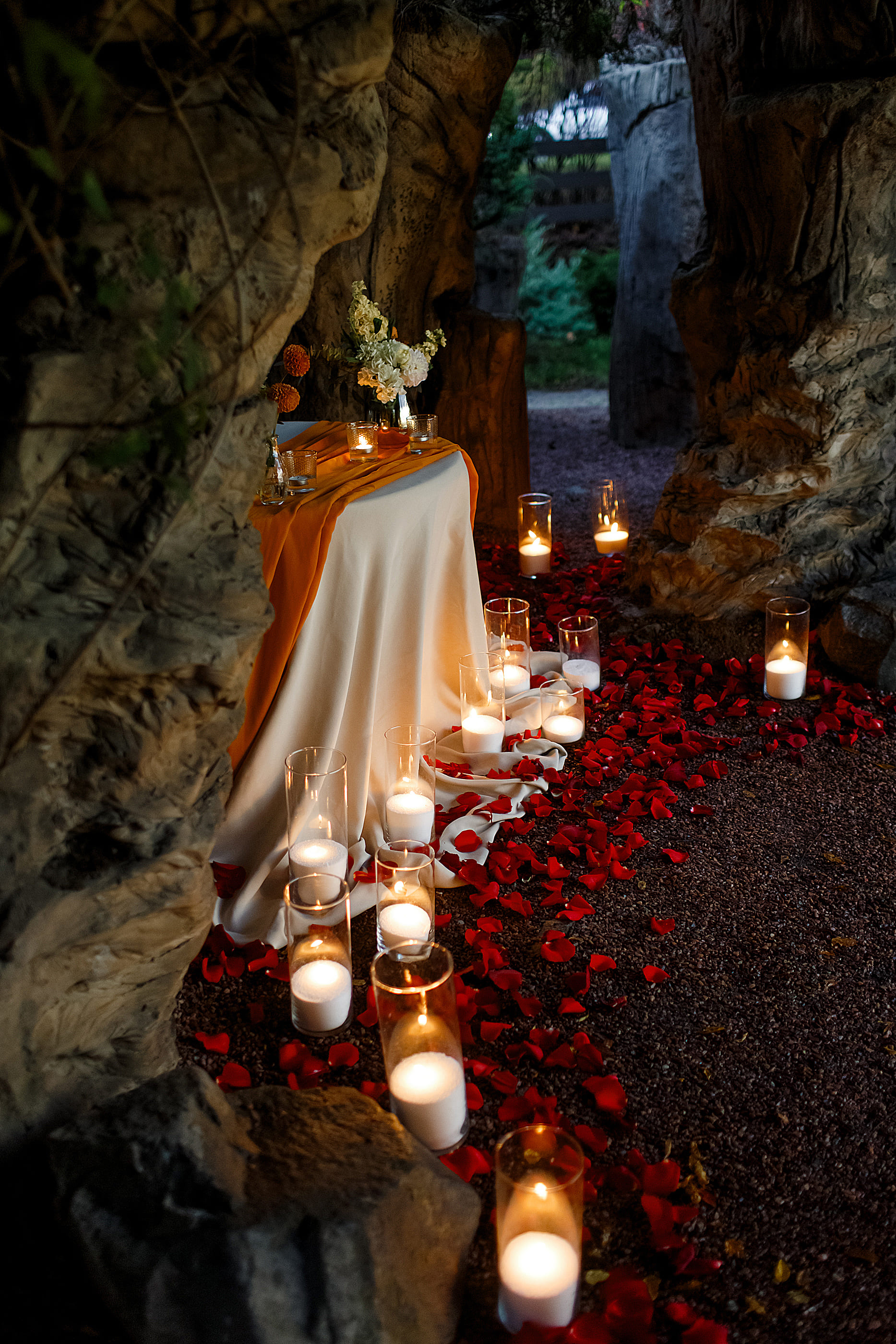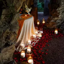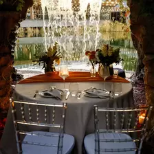 Изысканно сервированный стол, окруженный красивым романтическим декором, которое гармонично дополнит естественный наряд ) Мы закажем для вас вкусные блюда из изысканного ресторанного меню, так что гастрономическое удовольствие также гарантировано!)
